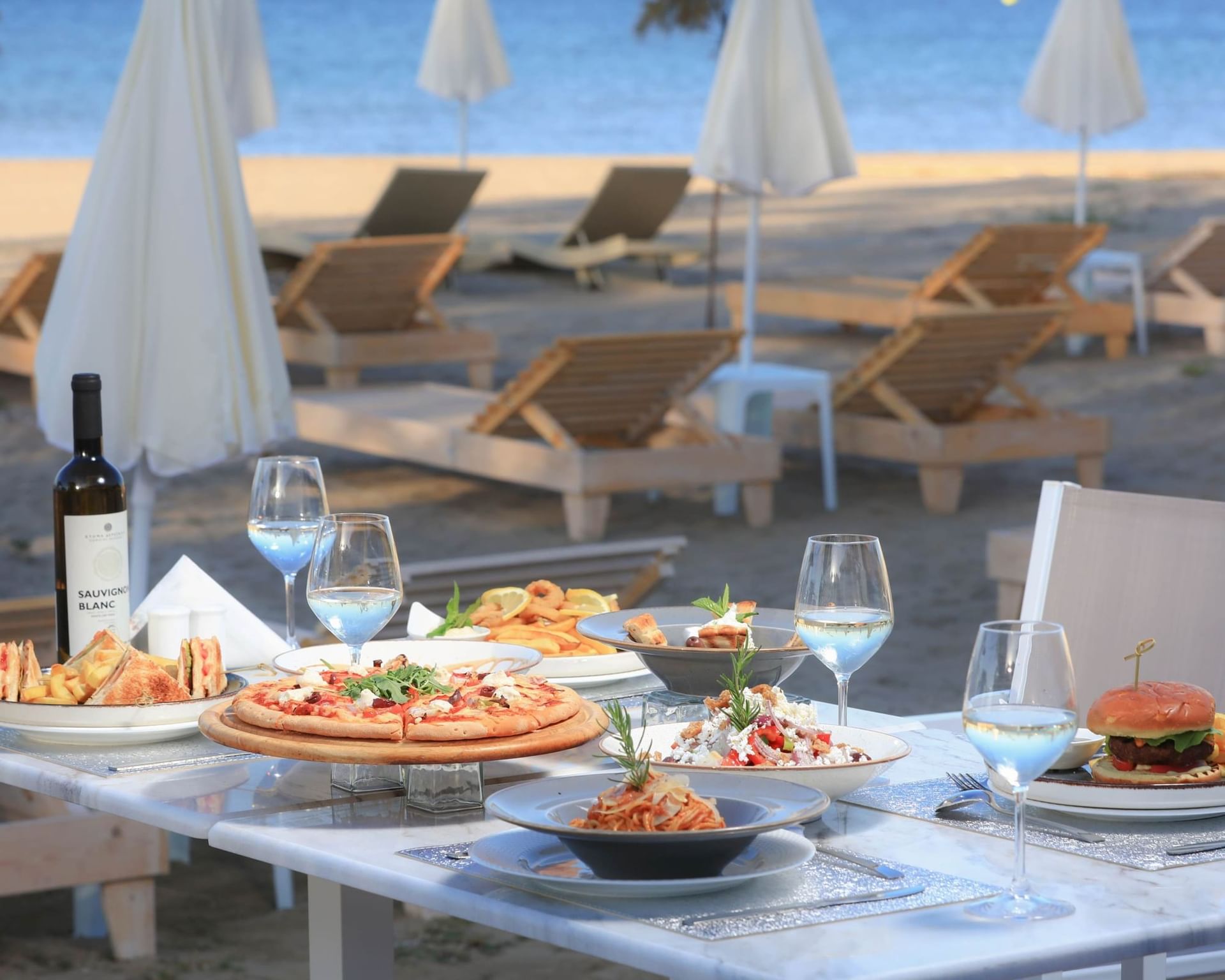 Καθώς απολαμβάνετε τον ήλιο και θαυμάζετε την εκπληκτική θέα στη θάλασσα, μπορείτε να απολαύσετε τα νόστιμα ελληνικά και μεσογειακά πιάτα μας, φτιαγμένα με μόνο τα πιο φρέσκα συστατικά.